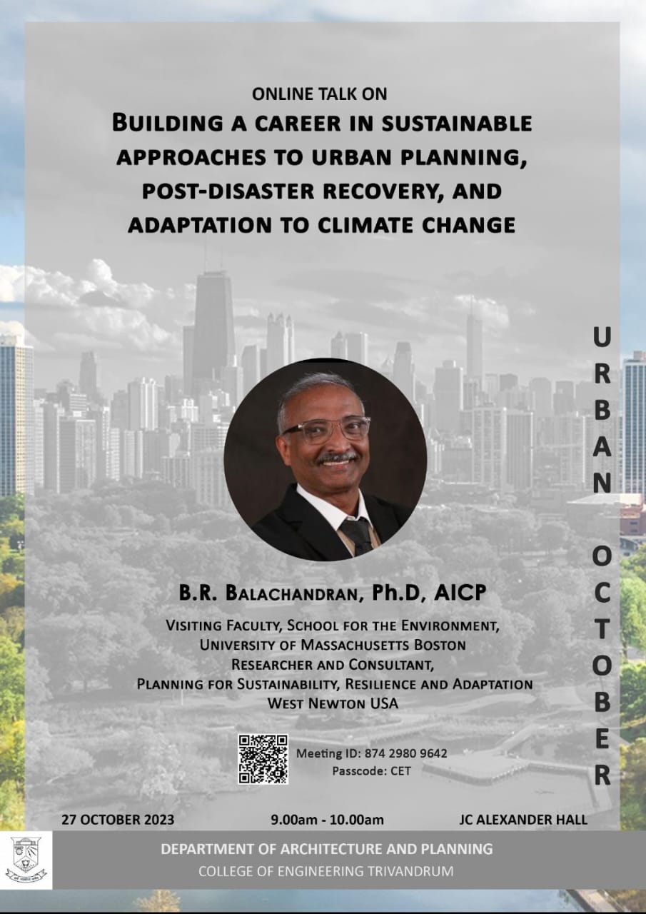 Dr. B.R. Balachandran, (1988 B.Arch) is delivering a talk on the occasion of Urban October