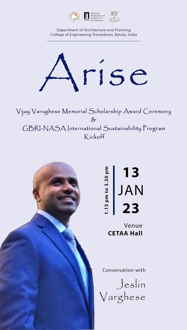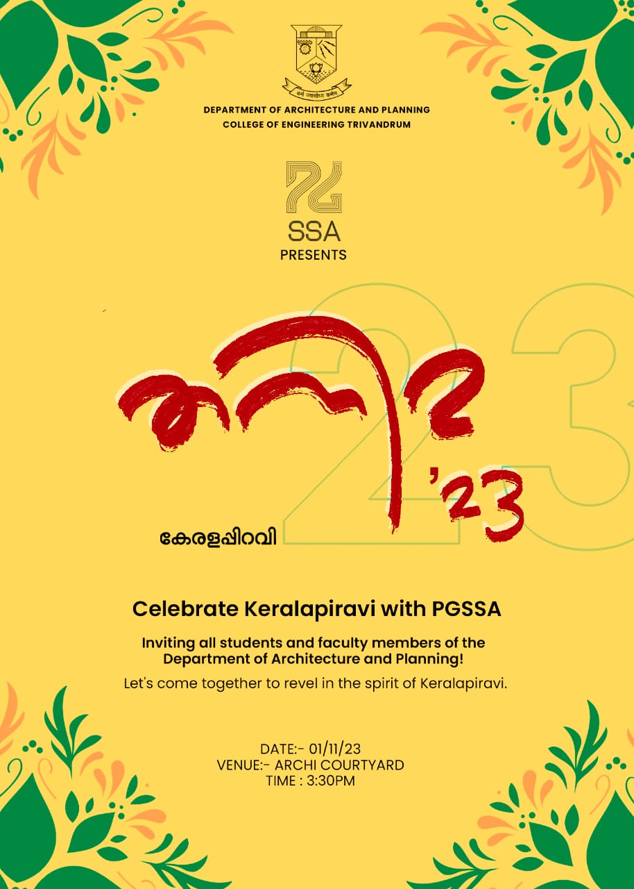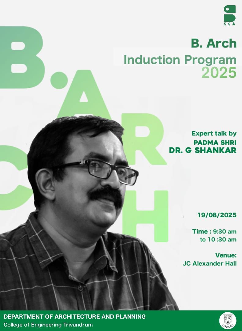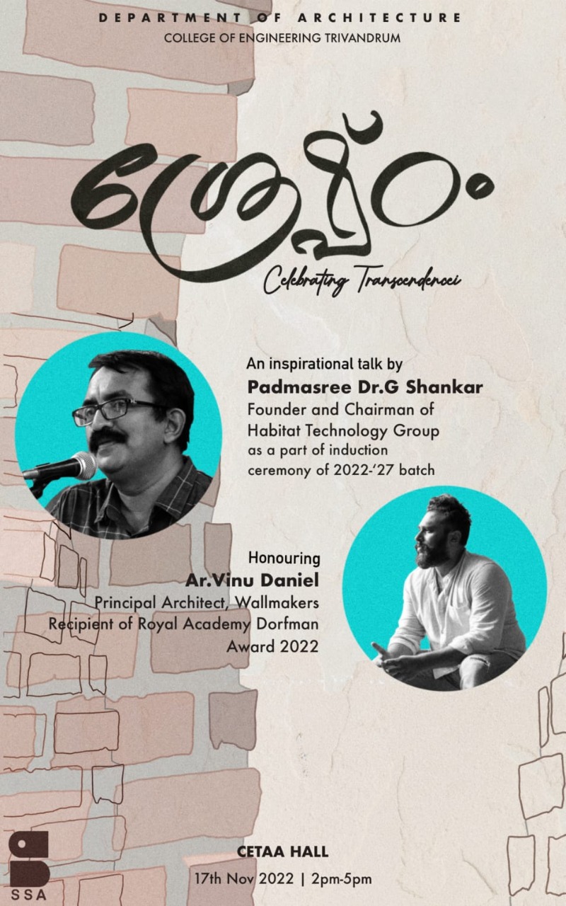 SRESHTAM - celebrating Transcendence will be conducted on 17.11.2022 (2 pm - 5 pm) at CETAA HALL - S1 B.Arch (2022 -27) Orientation session, by Padmashree Dr.G Shankar.