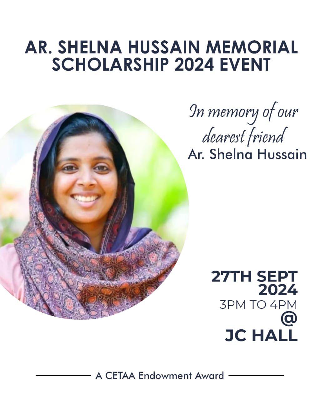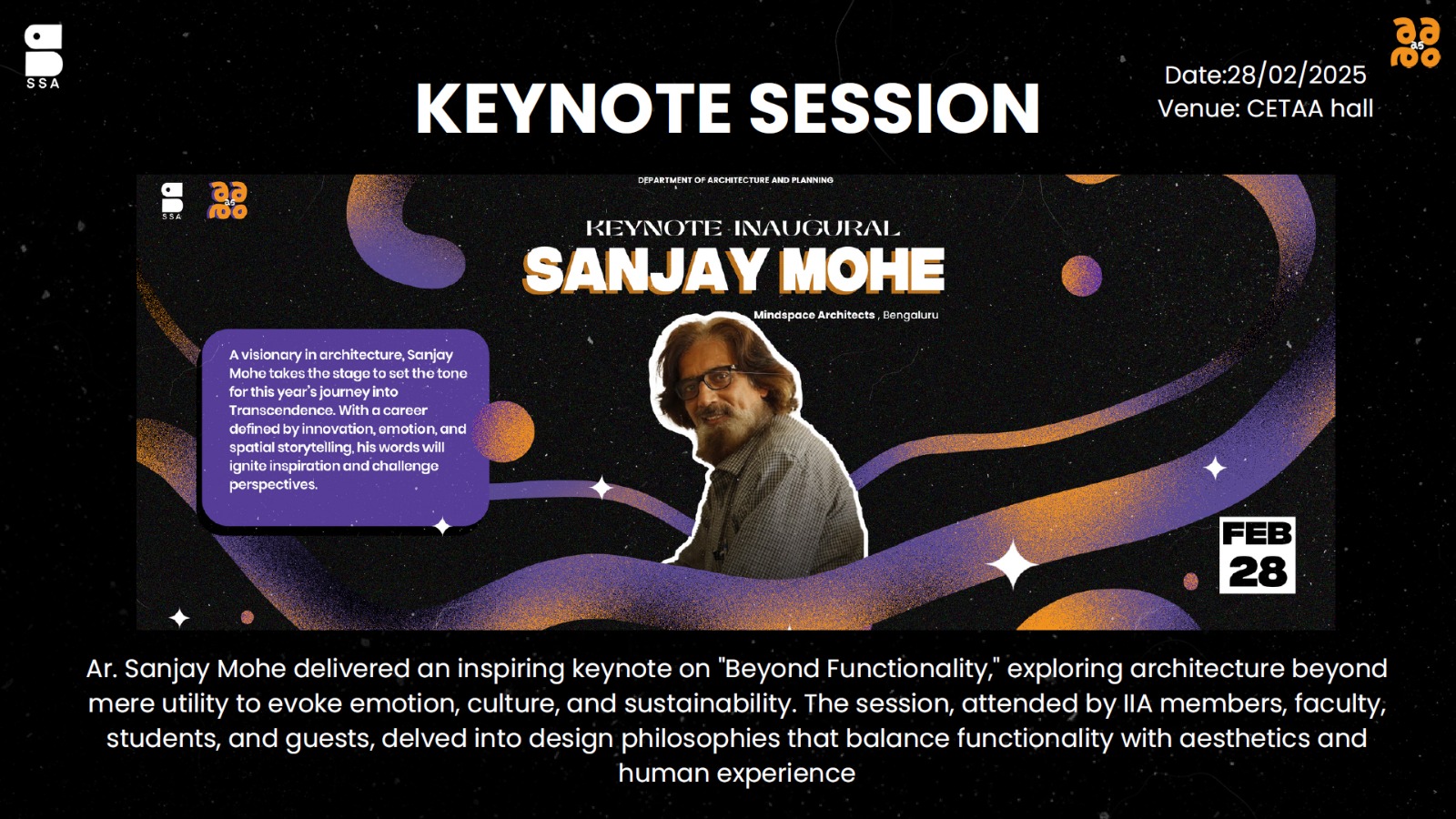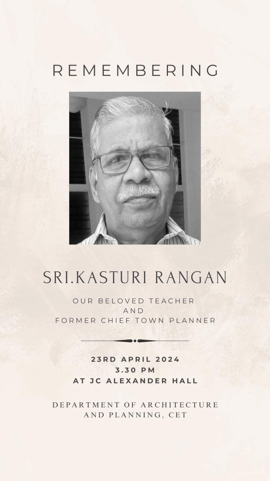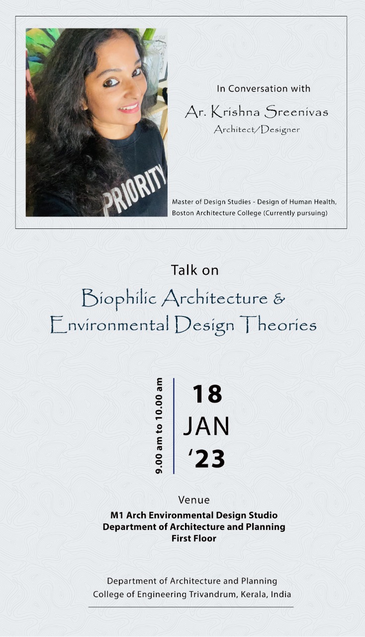 SRESHTAM - celebrating Transcendence will be conducted on 17.11.2022 (2 pm - 5 pm) at CETAA HALL - S1 B.Arch (2022 -27) Orientation session, by Padmashree Dr.G Shankar.