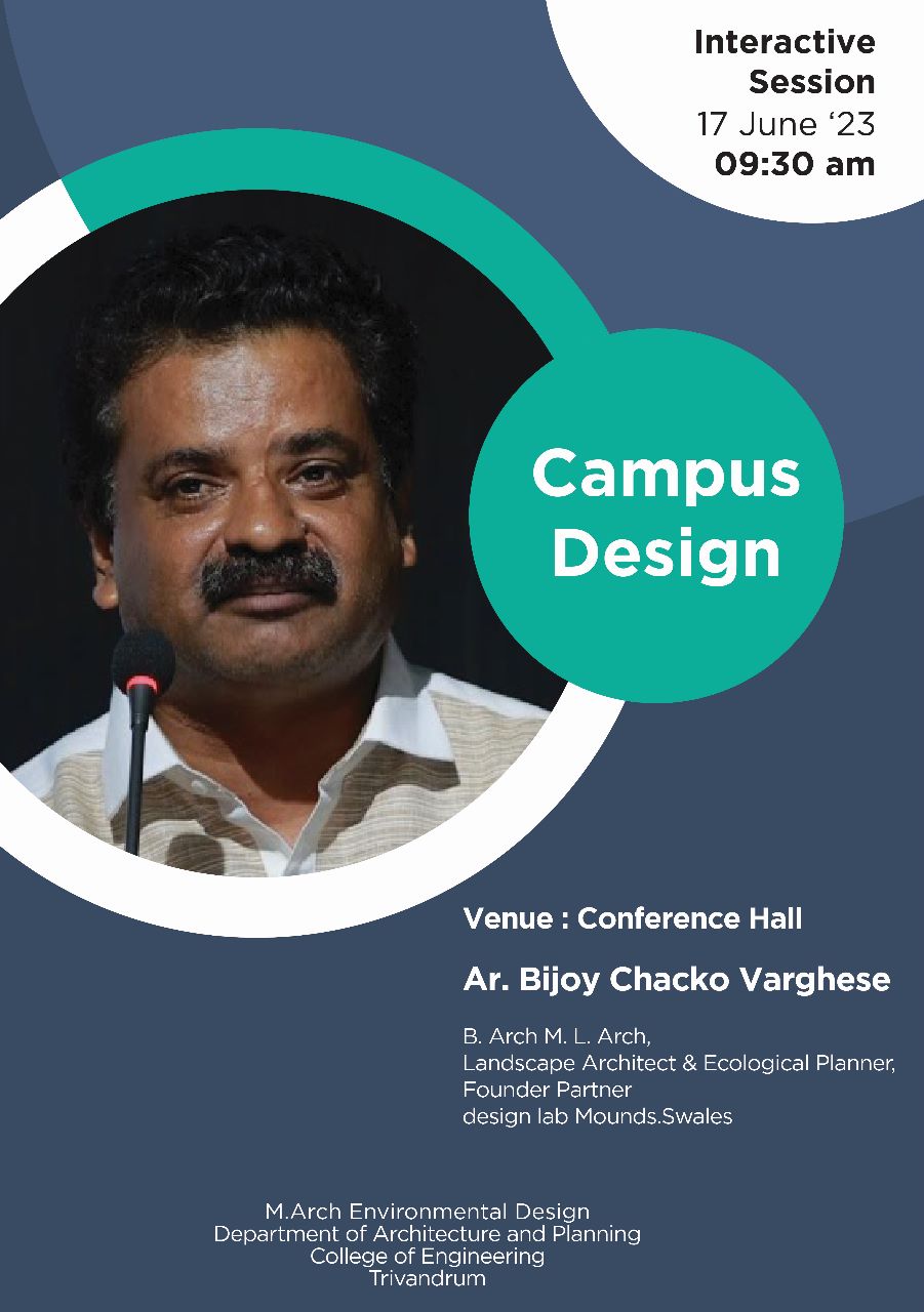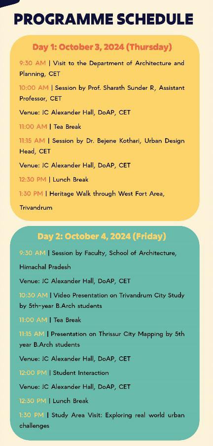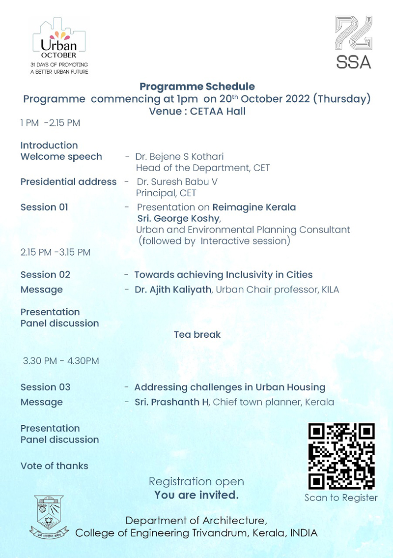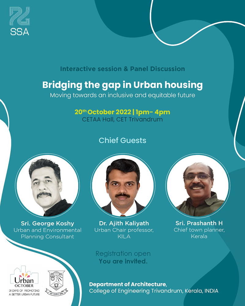 An interactive session and panel discussion with experts in Planning, Design and environment involving, Students, teachers and also professionals from other fraternity, on the occasion of ‘Urban October' which is "celebrating 31days of promoting a better urban future". The event is organised at CETAA Hall, CET on 20th October 2022.