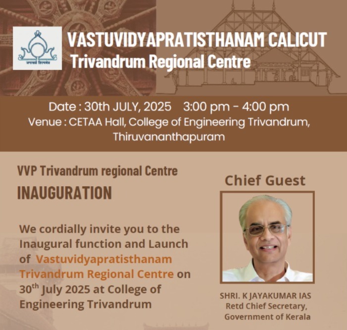 Vastuvidyaprathishtanam Trivandrum Regional Centre was inaugurated on 30/07/2025 by Sri. K. Jayakumar IAS, former Chief Secretary.