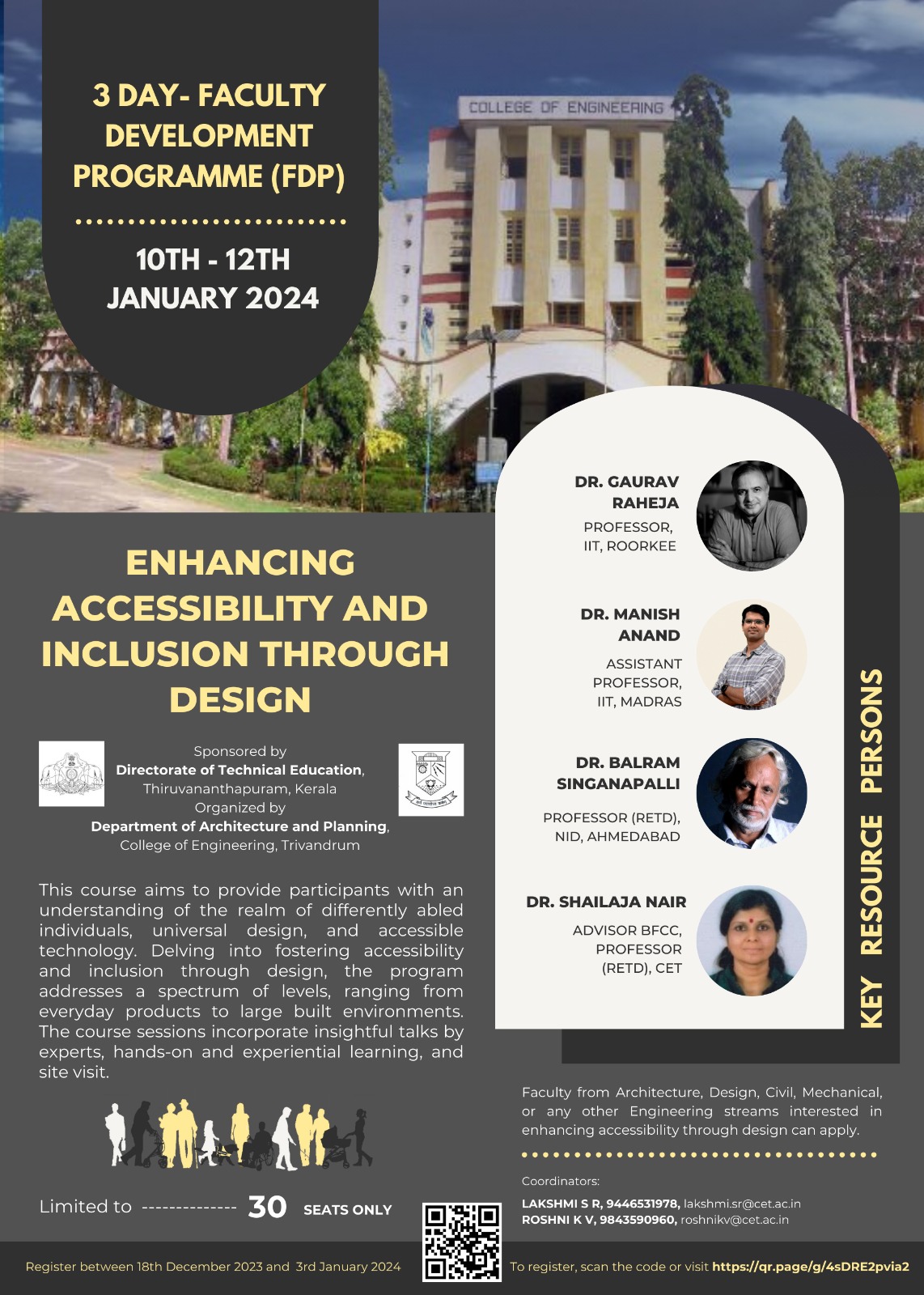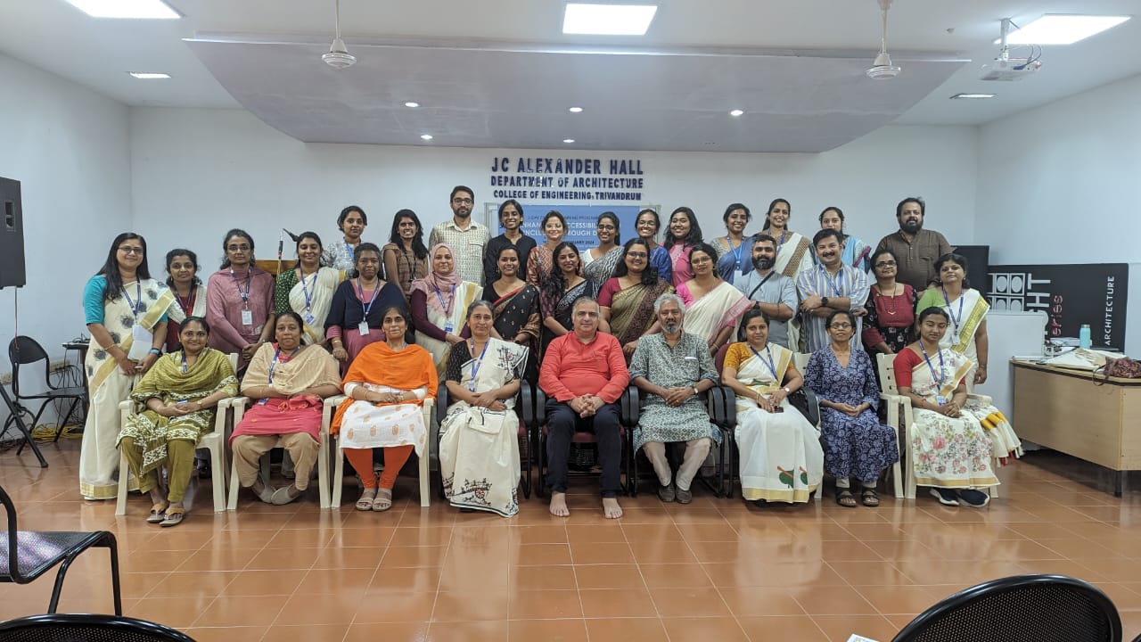 A three day faculty development program titled Enhancing Accessibility and inclusion through Design was organised by the Department of Architecture and Planning , College of Engineering Trivandrum from 10 January to 12 January 2024. The program, sponsored by the Directorate of Technical Education, offered its participants an insight into the world of the people with disability, accessibility and assistive technology through expert talks, site visit and hands on design experience.