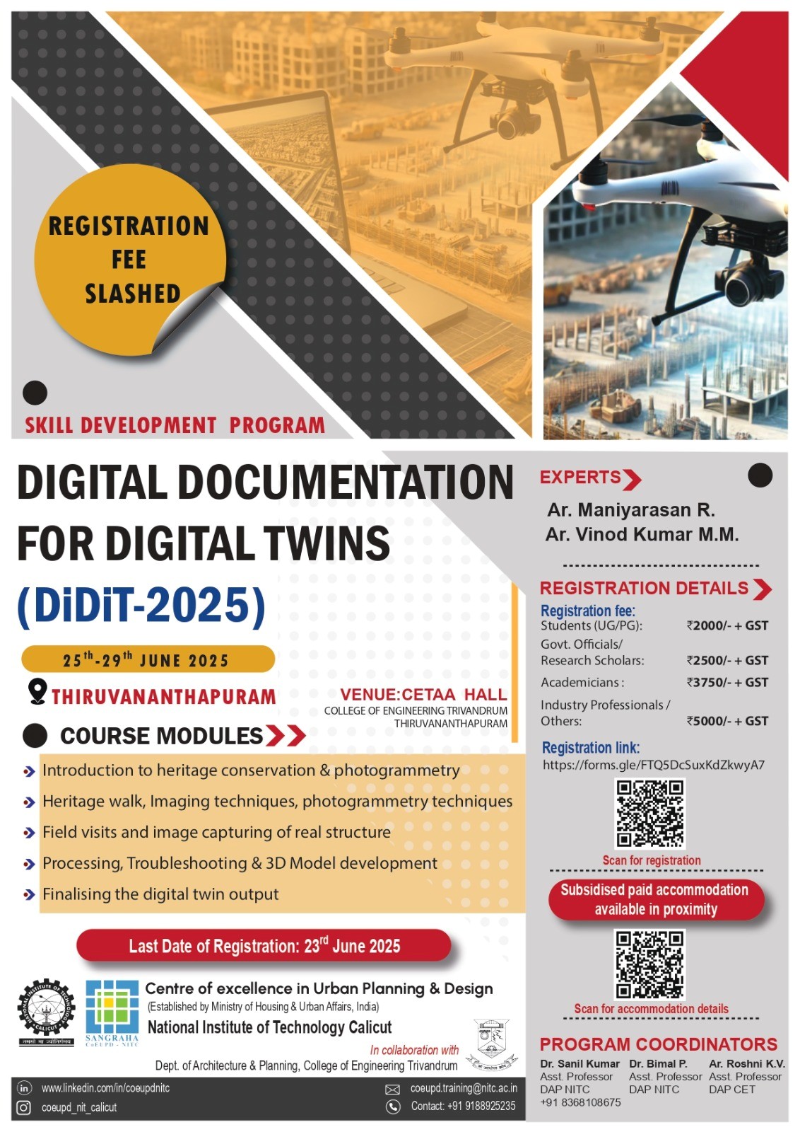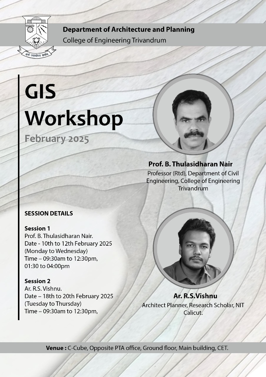 The Department of Architecture and Planning, College of Engineering Trivandrum, in collaboration with the Centre of Excellence for Urban Planning and Design, NIT Calicut, conducted a five-day workshop titled "Digital Documentation for Digital Twins" from 25th to 29th June 2025. The workshop sessions were conducted by Ar. Vinod MM, conservation architect and Ar. Maniyarasan, expert in photogrammetry. The workshop consisted of both theory based and hands-on sessions in which a documentation of the Koyikkal Palace, Nedumangad, was done using Photogrammetry technique.