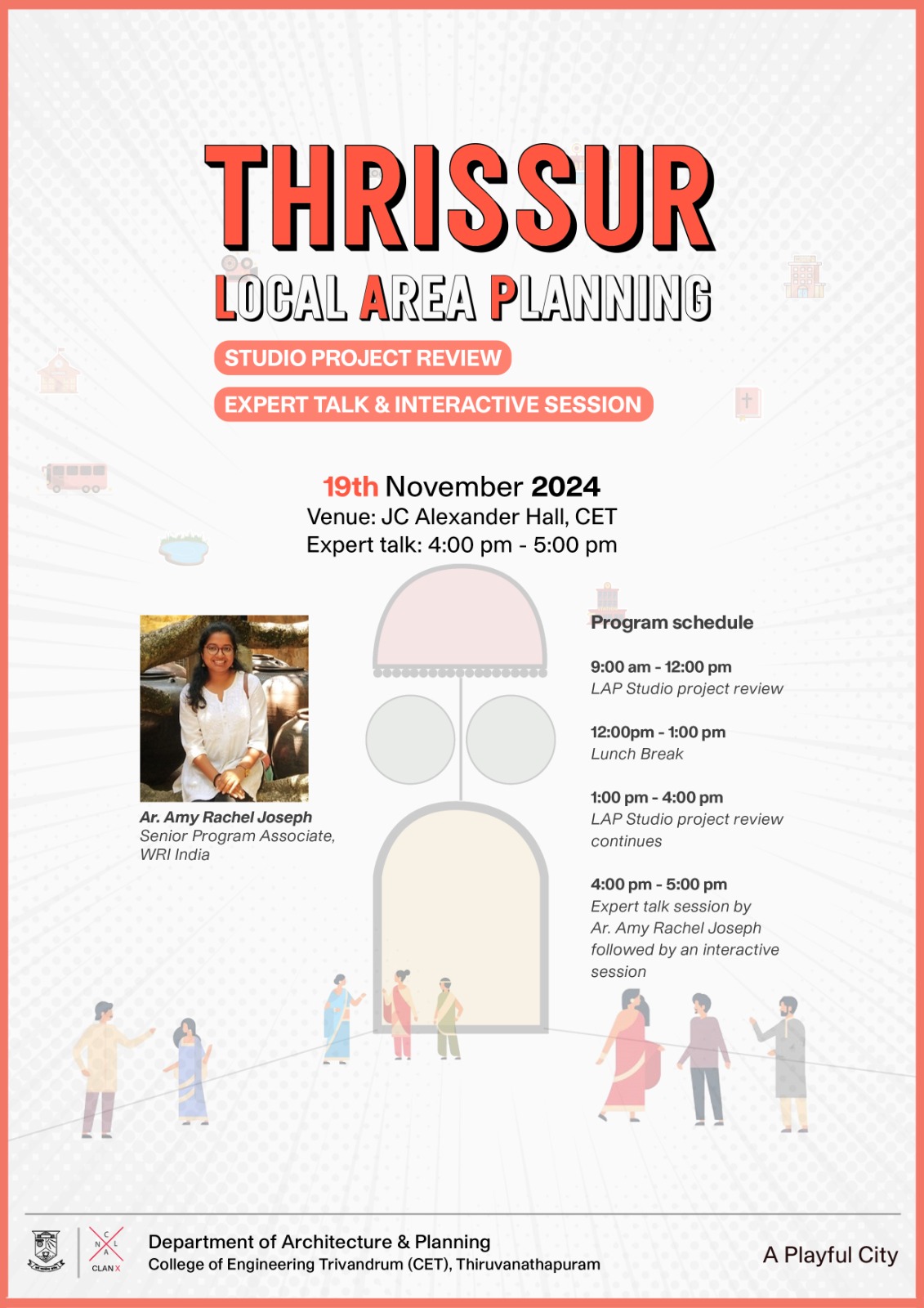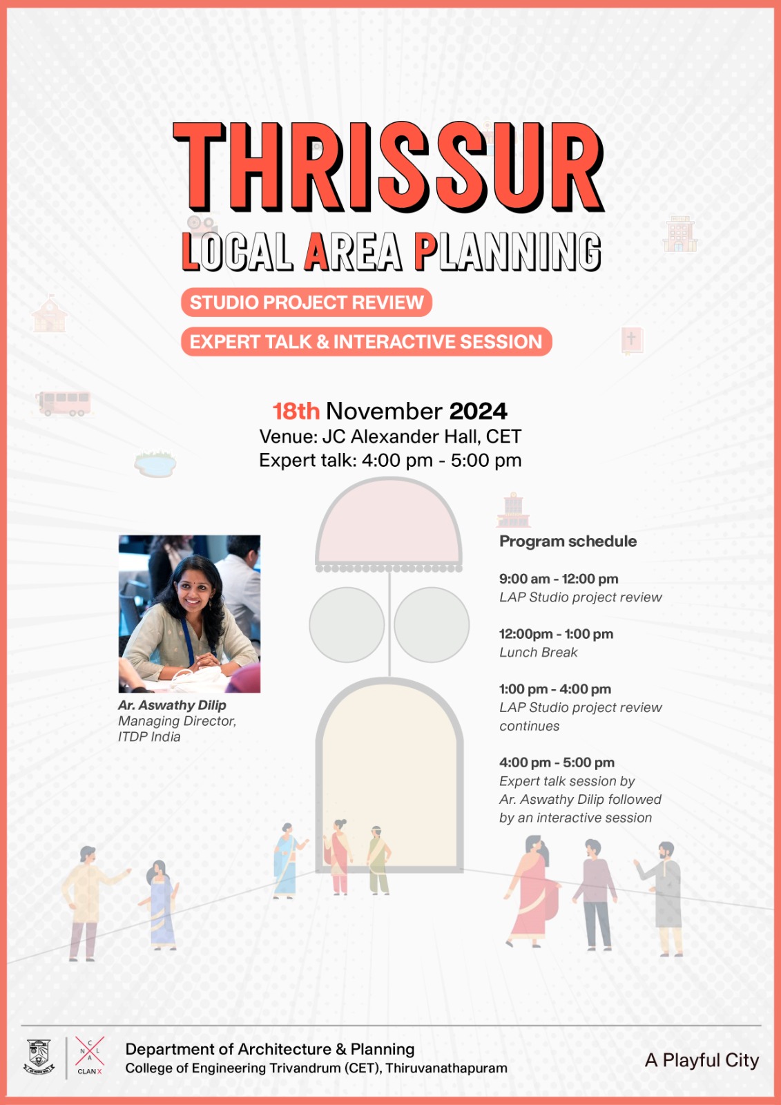 Expert talks led by Ar. Aswathy Dilip (Managing Director at ITDP India) and Ar. Amy Rachel Joseph (Senior Program Associate at WRI India) conducted on 18th and 19th of November, 2024 respectively, where they had presented their urban design projects.