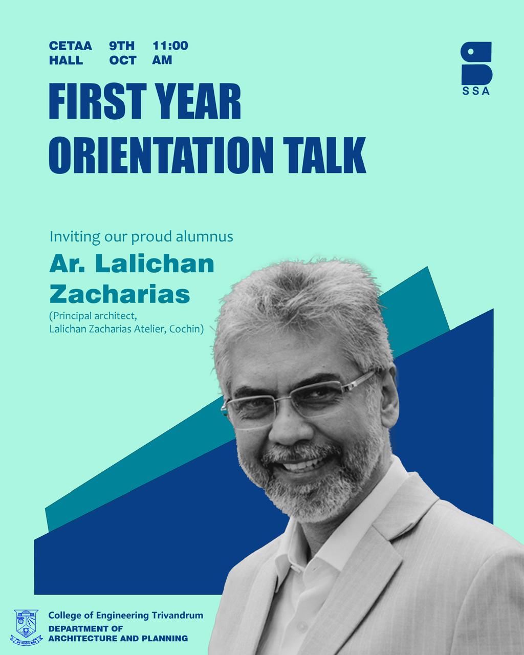 First year B.Arch Orientation conducted in the Department of Architecture and Planning. Ar. Lalichan Zacharias (Principal Architect Lalichan Zacharias Atelier, Cochin & our proud Alumnus) addressed the students of first year B.Arch on 9th Oct 2024 at JC Alexander Hall.
