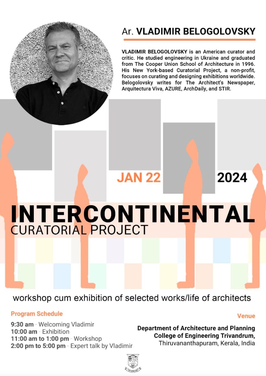 The Department of Architecture and Planning, College of Engineering Trivandrum, hosted an exhibition and workshop as part of the Intercontinental Curatorial Project by Ar. Vladimir Belogolovsky. The students and faculty members of the department participated in this event on the 22nd of January. The exhibition included the works of twelve internationally renowned architects. The event was concluded with a talk by Ar. Vladimir