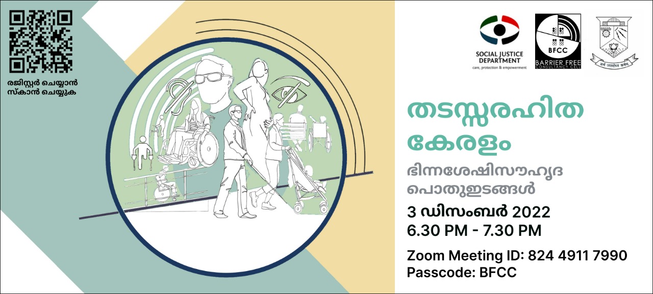 ലോക ഭിന്നശേഷി ദിനാചരണത്തിന്റെ ഭാഗമായി ബാരിയർ ഫ്രീ കൺസൾട്ടൻസി സെൽ 3 ഡിസംബർ 2022 വൈകിട്ട് 6.30 മുതൽ 7.30 വരെ തടസ്സരഹിത കേരളം: ഭിന്നശേഷിസൗഹൃദ പൊതുഇടങ്ങൾ എന്ന വിഷയത്തിൽ വെബിനാർ സംഘടിപ്പിക്കുന്നു.